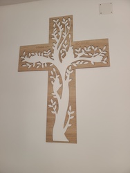 Crucea din lemn sculptată ca autocolant pentru perete este un accesoriu de casă frumos și tradițional, pentru living, bucătărie sau la intrare deasupra ușii. Acest sticker cu cruce de perete va face cu siguranță fiecare casă confortabilă. Acesta nu este un autocolant de hârtie obișnuit, este un decor din lemn de 3 mm grosime, datorită căruia autocolantul pe perete creează un efect 3D.