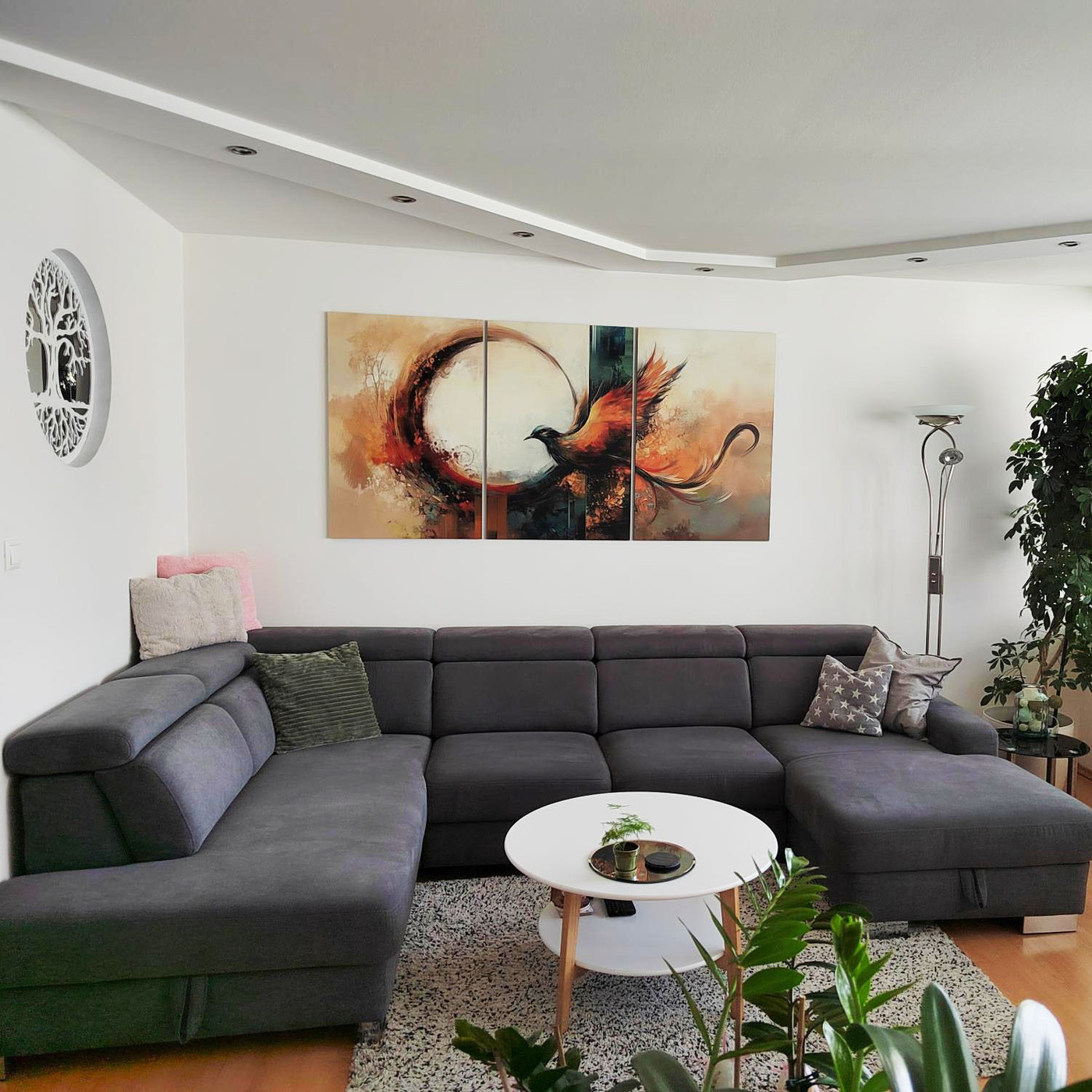 Frumos tablou, frunzele ar fi putut fi mai aurii. M-am temut de dimensiuni, nu știam ce mărime de tablou să aleg, dar se potrivește perfect și se asortează cu mobilierul.