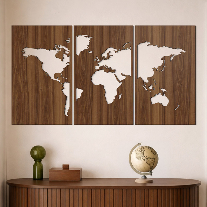 Tablou autocolant din lemn de perete într-un design aparte realizat mai multe piese. Datorită materialului din lemn de 3 mm grosime, harta creează un efect 3D pe pereteMap world este o decorațiune originală pentru casă care cu siguranță nu trebui să lipsească din locuința niciunui călător pasionat. Tabloul se potrivește pe peretele din living, camera copiilor sau birou.