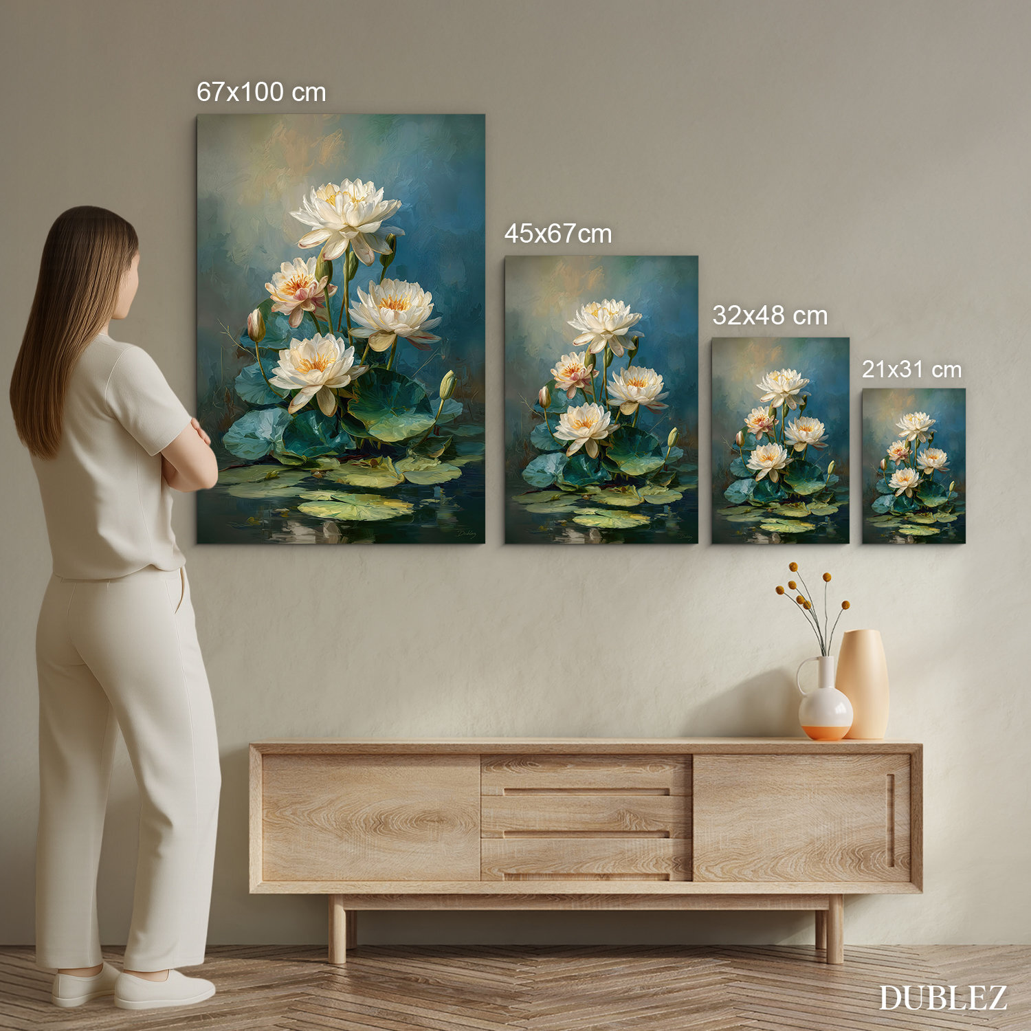 Tablou din lemn cu flori aduce în interior frumusețea atemporală a nuferilor înfloriți. Prelucrarea artistică amintește de o pictură clasică în ulei, unde tușele impresioniste de pensulă creează un joc de lumină și umbră pe petalele albe. Tabloul cu nuferi este soluția ideală pentru a revitaliza dormitorul sau livingul. Se potrivește perfect în spații decorate în stil romantic, provențal sau modern.