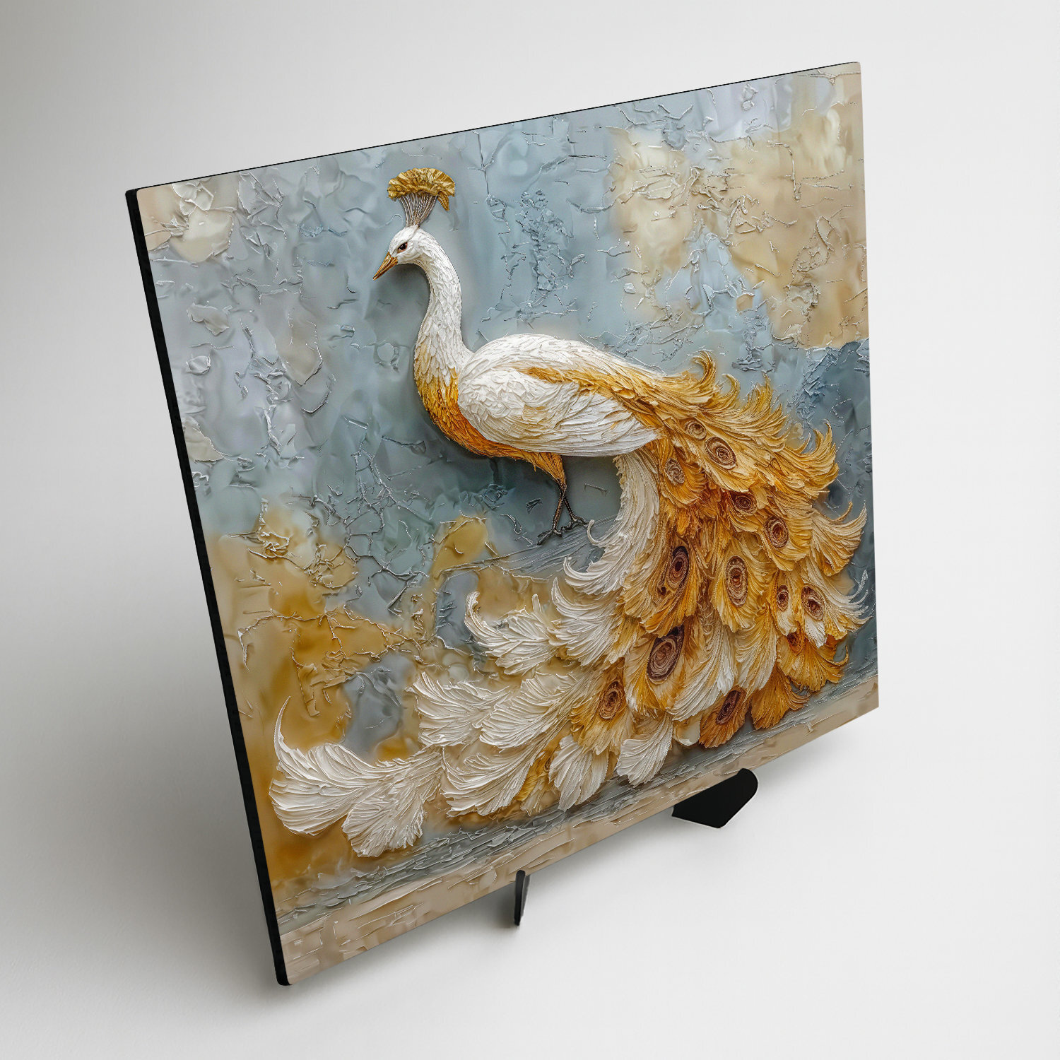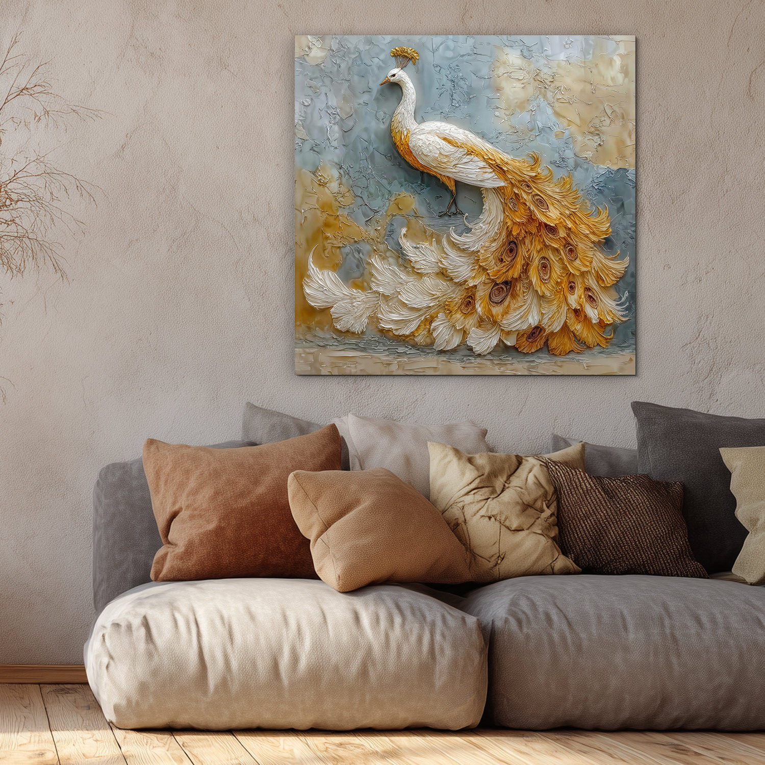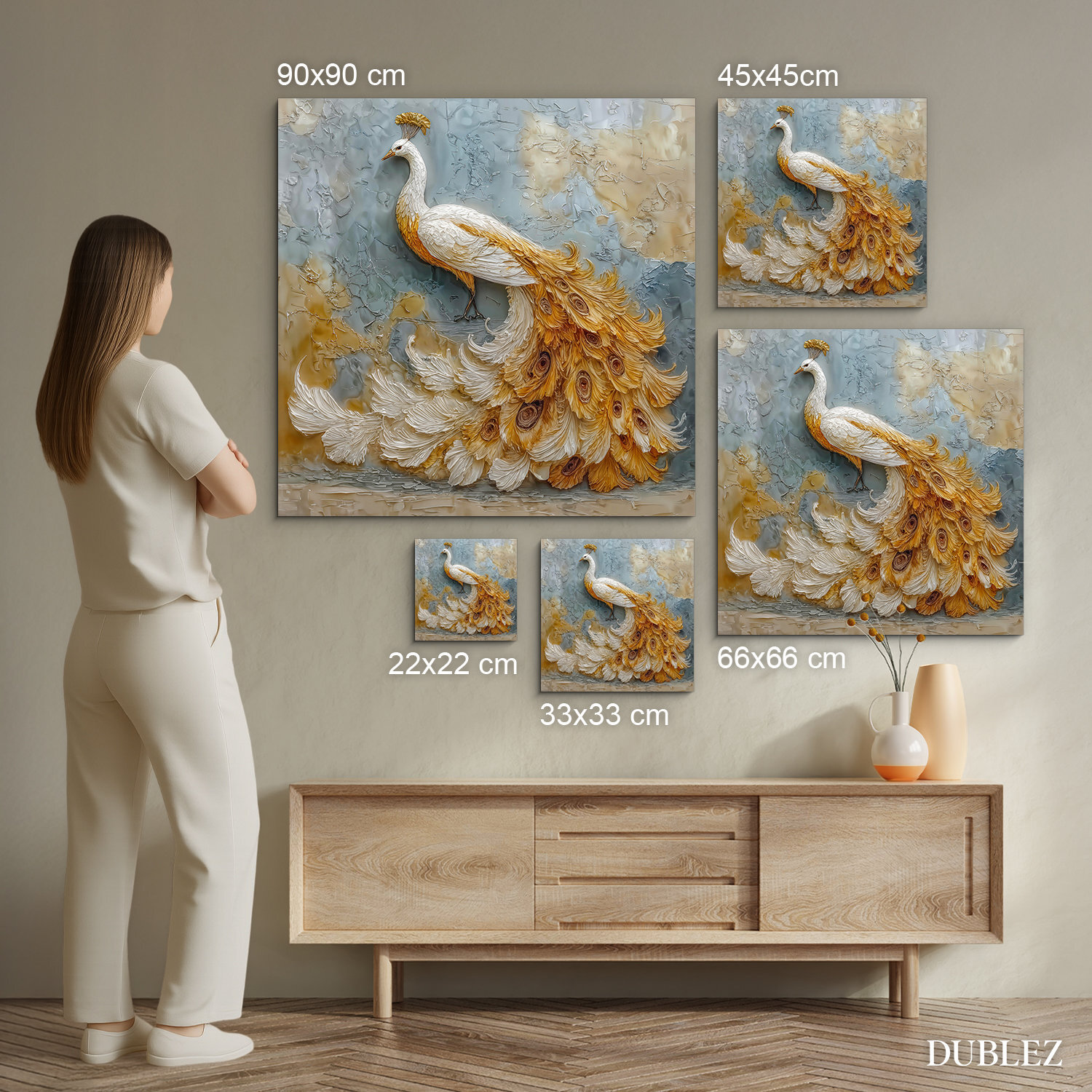 Tablou luxos al păunului, care imediat atrage atenția prin postura sa nobilă și detaliile fine. Tabloul colorat combină puritatea albă, nuanțele aurii ale luxului și un fundal gri-albăstrui. Se potrivește perfect în interiorul modern și clasic – în living, hol, birou sau dormitor elegant.