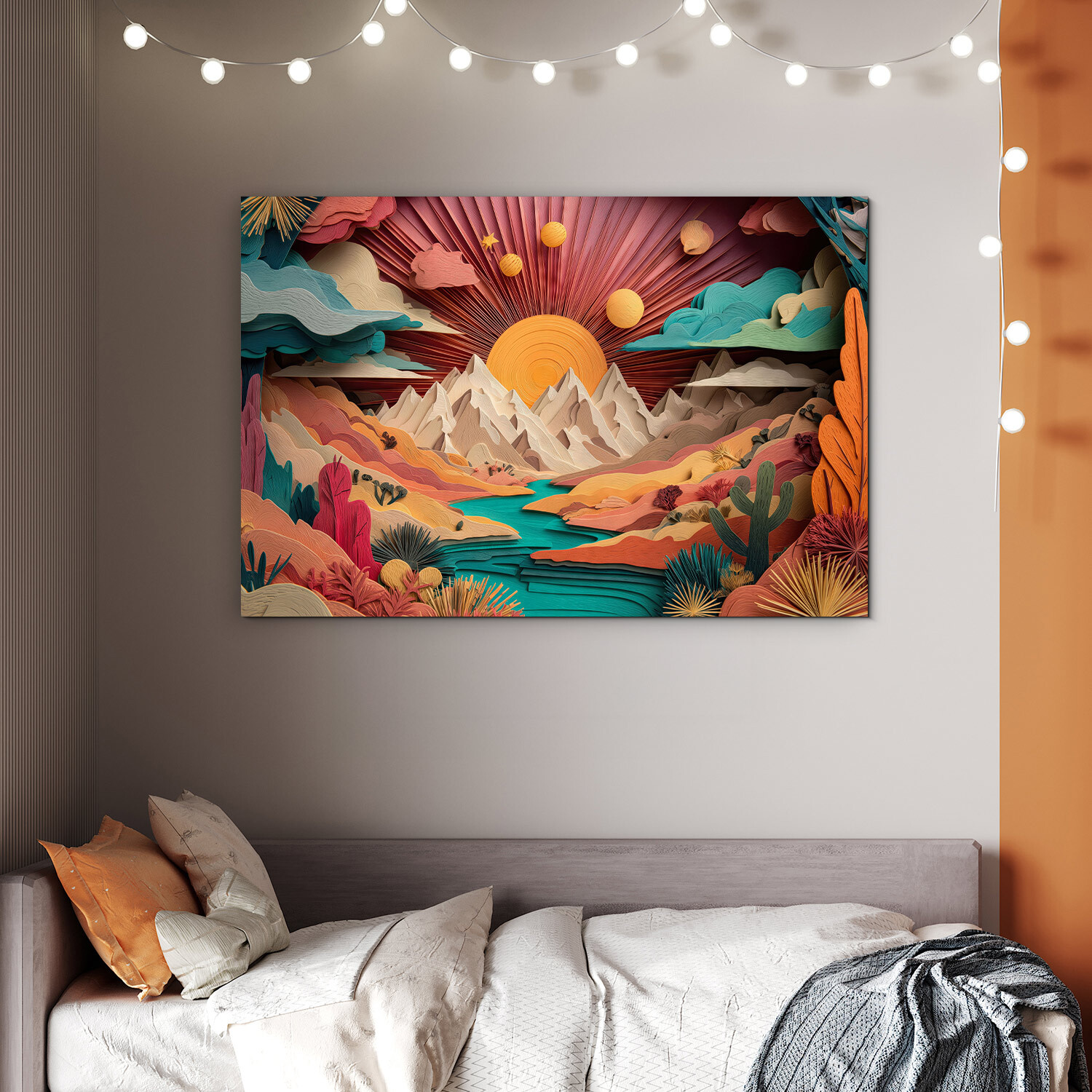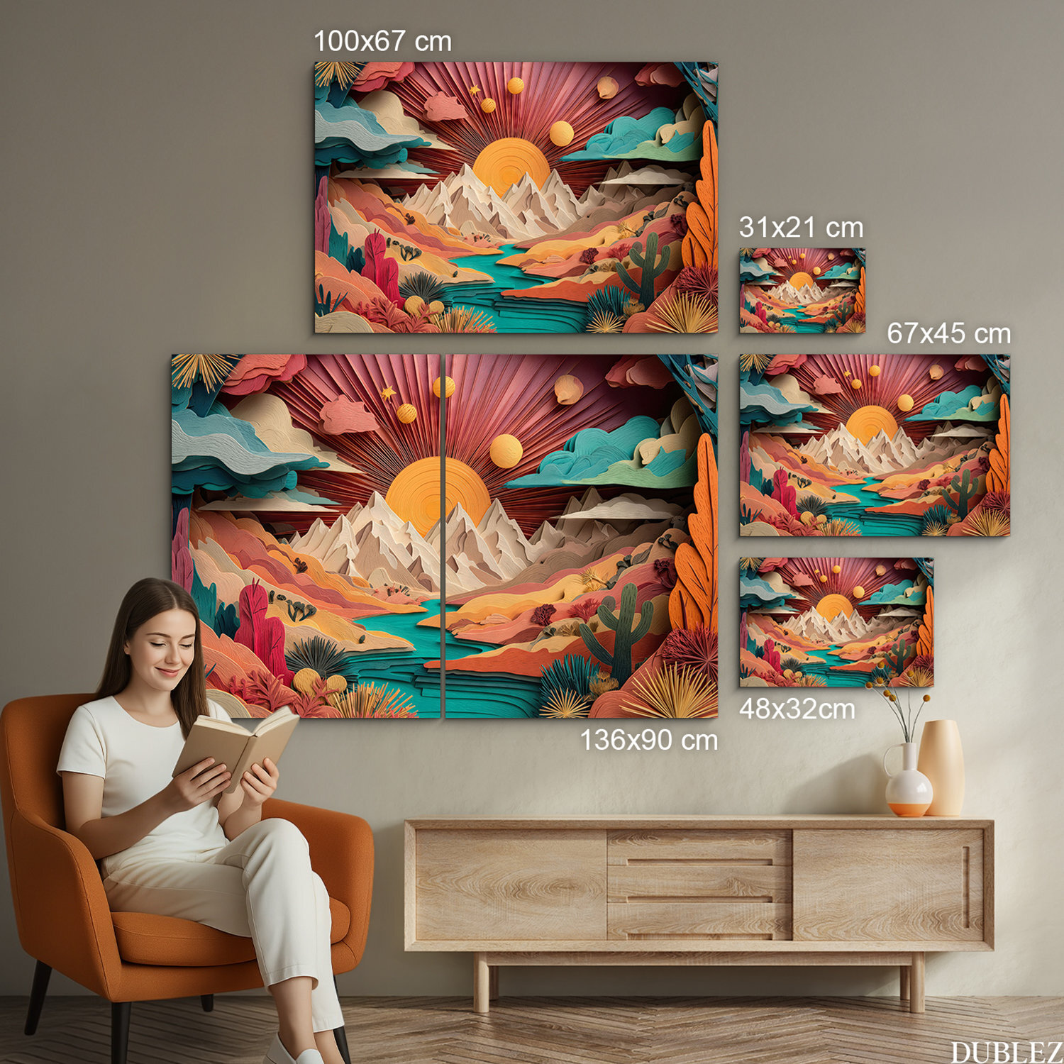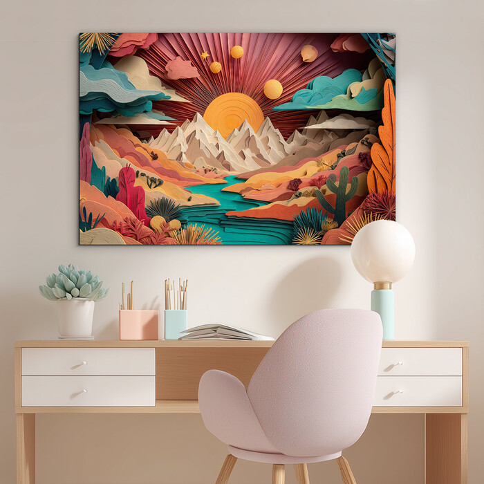 Tablou din lemn - Lumea Origami este o decorare jucăușă pentru perete cu efect de hârtie stratificată, care amintește de un colaj precis din forme colorate. Soarele deasupra vârfurilor montane, un râu sinuos și un peisaj fantastic au un efect optimist și iluminează fiecare perete într-un mod modern. Datorită celei mai moderne tehnologii de imprimare, tabloul creează o iluzie fascinantă de adâncime, deși suprafața sa este netedă. Tabloul se evidențiază excelent în camera copiilor sau a studenților, sau în birouri creative, unde va stimula imaginația și buna dispoziție. Datorită combinației de culori pastelate și intense, se potrivește în interioruri moderne, boho, dar și în cele ușor scandinave. Este alegerea ideală pentru oricine caută un accesoriu original și creativ pentru casa sa.