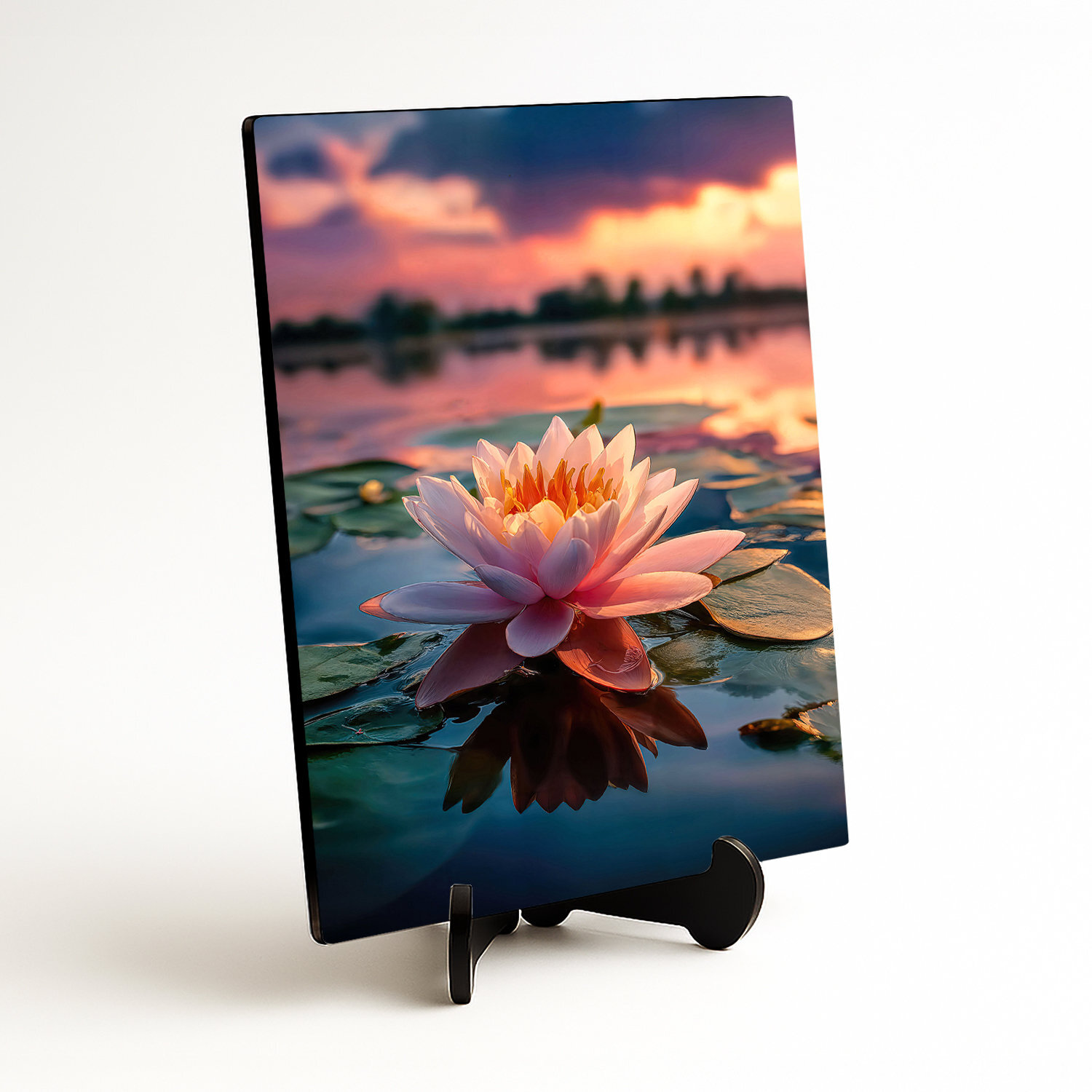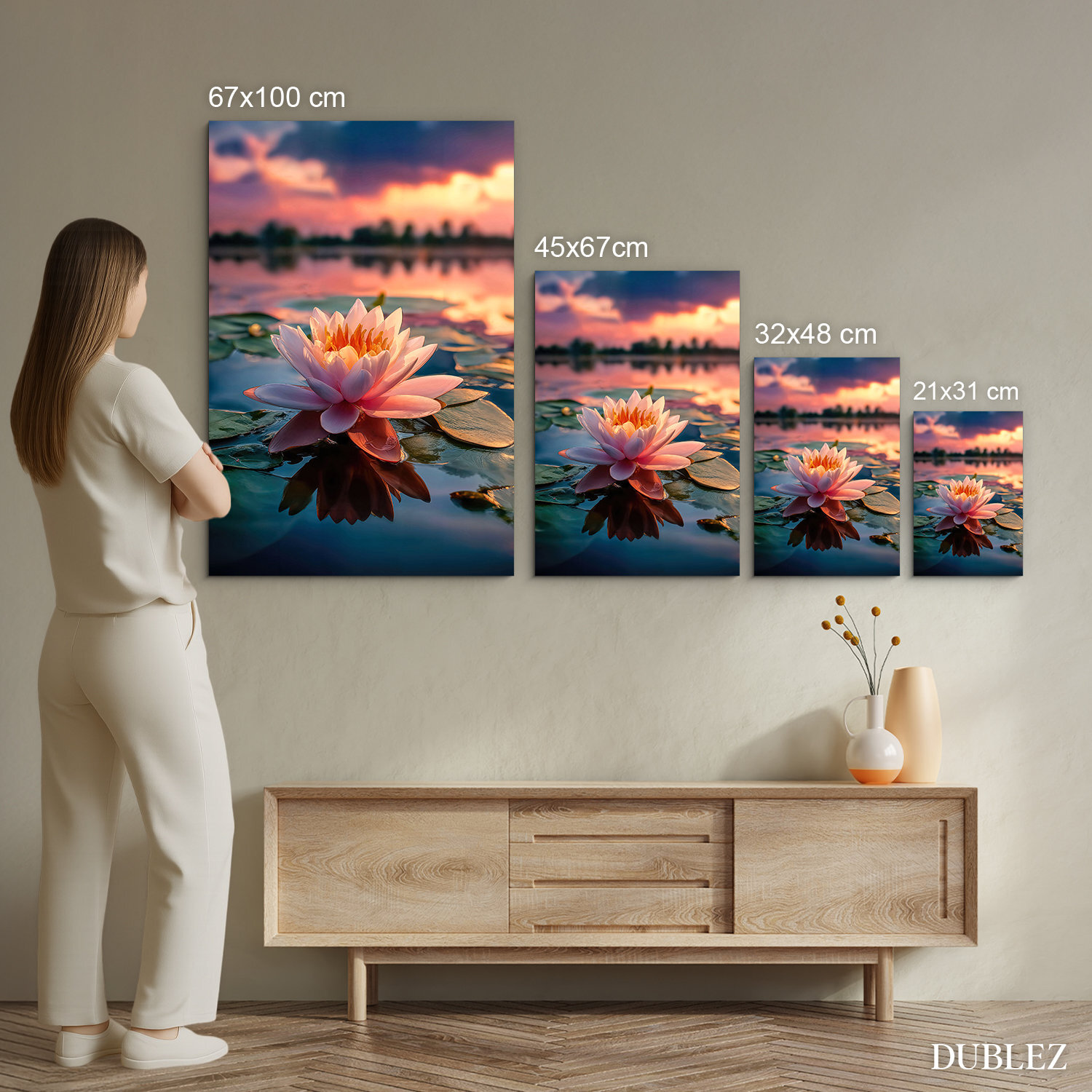 Tabloul din lemn - Nufăr este un accesoriu ideal pentru interior. Floarea de nufăr, surprinsă la suprafața lacului în lumina apusului, emană delicatețe, eleganță și în același timp un aer modern. Se potrivește perfect în living, dormitor, hol sau birou. Se evidențiază frumos în combinație cu materiale naturale și mobilier în nuanțe deschise sau mai închise.