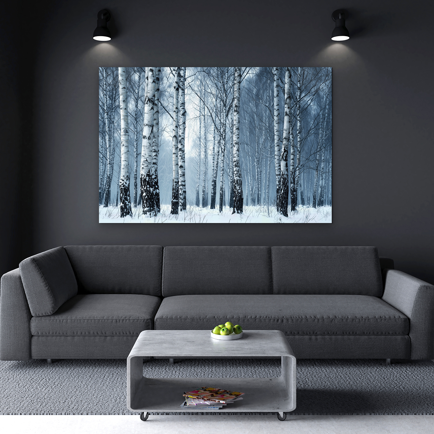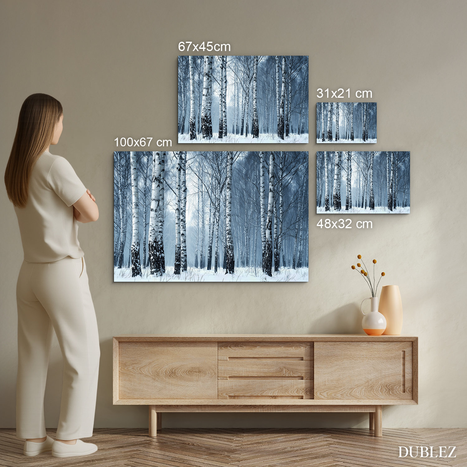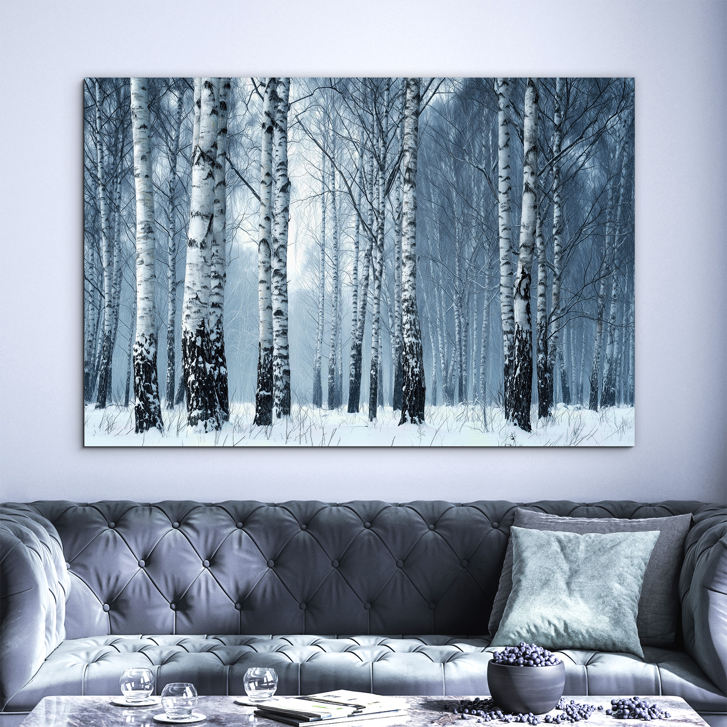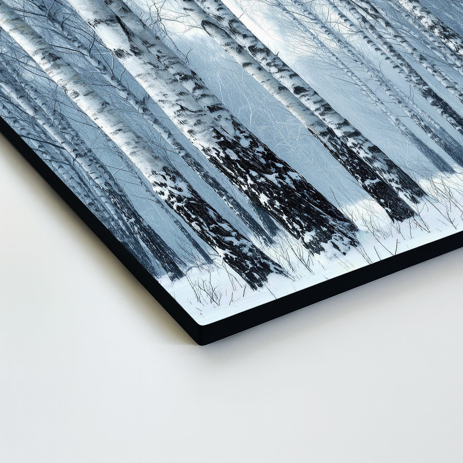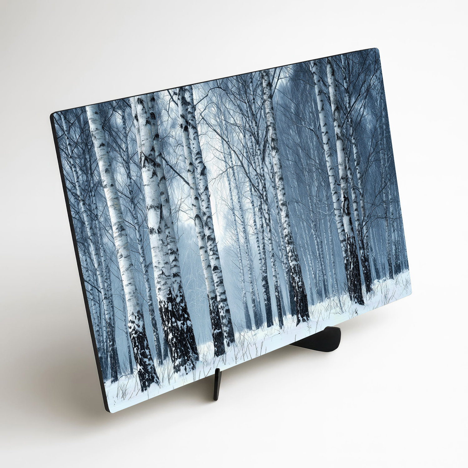 Tablou din lemn - Mesteceni într-o pădure de iarnă surprinde un peisaj liniștit, acoperit de zăpadă, cu o ceață delicată și trunchiuri de copaci redate realist. Mestecenii albi cu scoarță neagră, în nuanțe reci, creează o atmosferă calmă și relaxantă. Acest tablou modern din lemn se evidențiază ca o decorațiune superbă în living, birou sau dormitor.