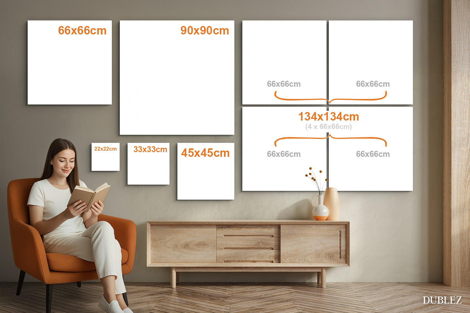 1. 22x22 cm, 33x33 cm, 45x45 cm, 66x66 cm, 90x90 cm - Tabloul este format dintr-o singură piesă.