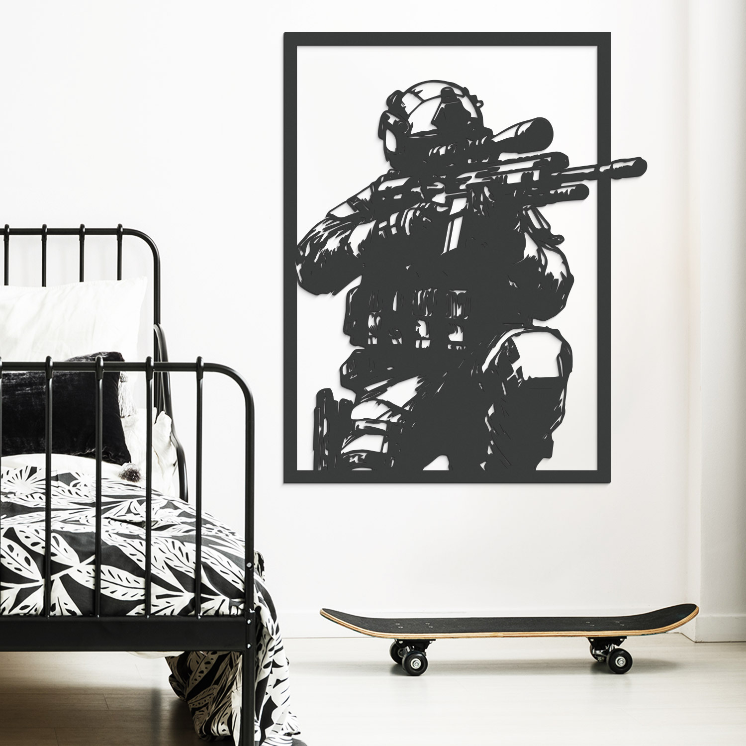 Tabloul din lemn cu lunetist surprinde imaginea unui soldat pregătit pentru un foc de precizie. Detaliile atent decupate conferă acestui tablou 3D un design realist, care se evidențiază în orice interior. Se potrivește perfect în camera unui copil sau adolescent și reprezintă un cadou ideal pentru gameri, pasionați de military sau airsoft.