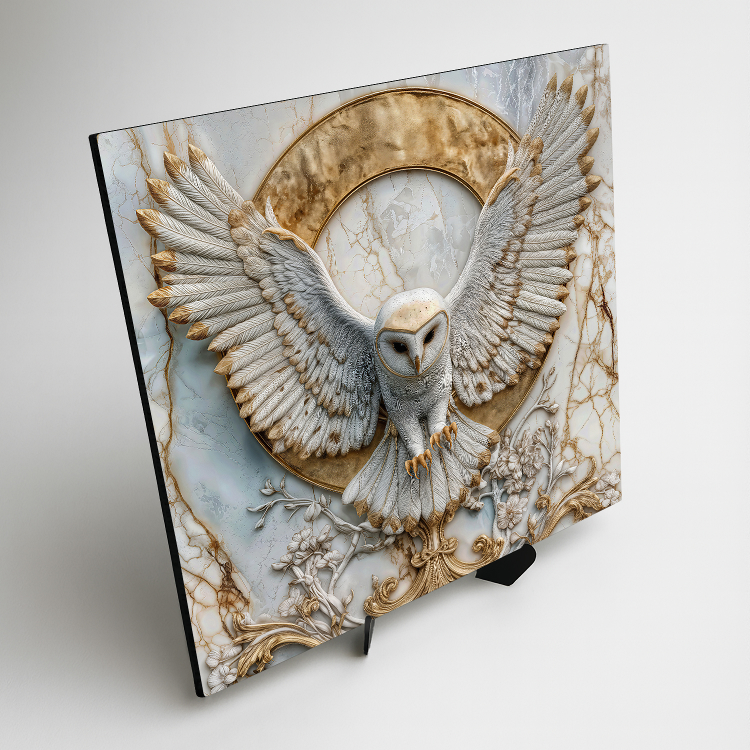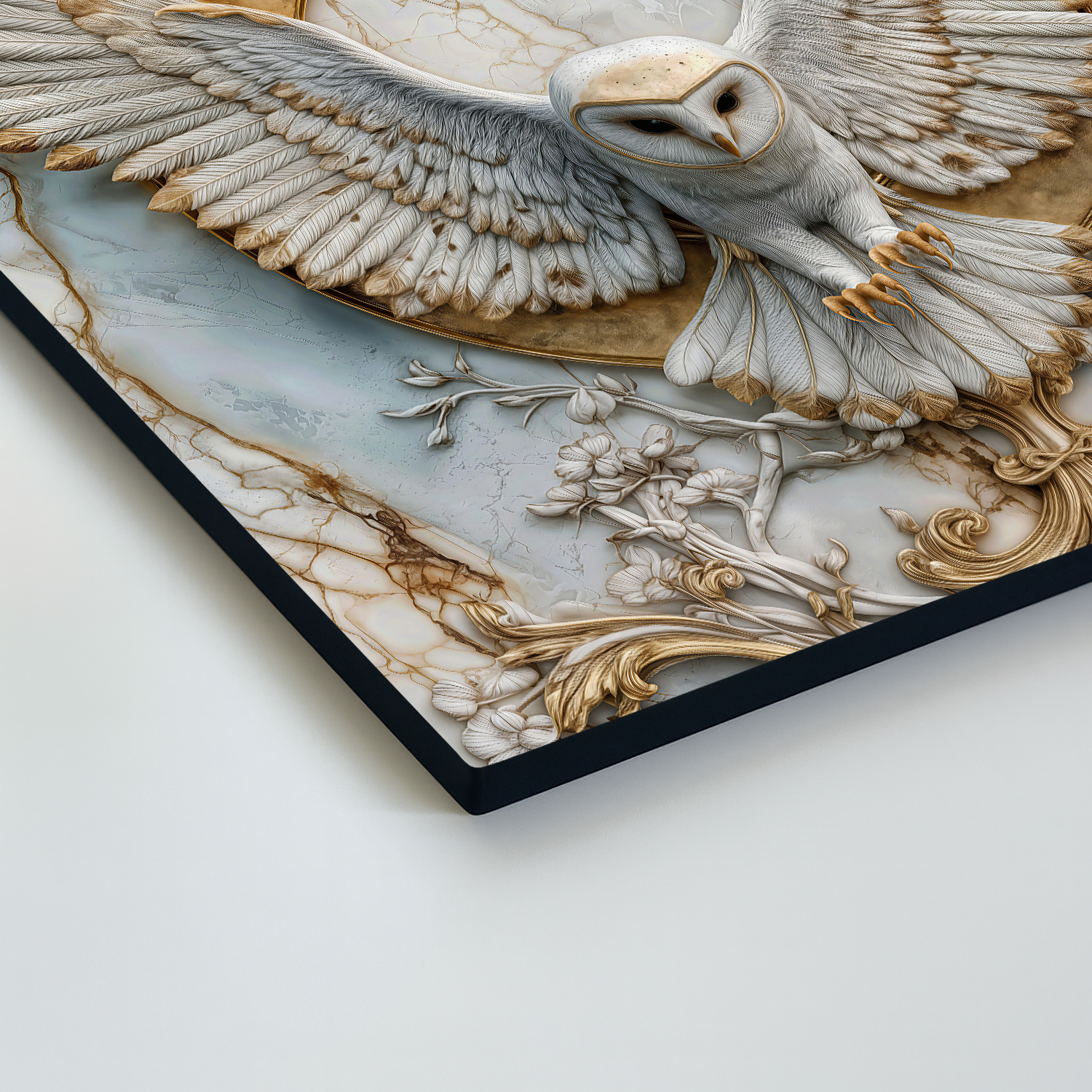 Un tablou elegant cu bufniță albă în zbor, încadrată de un cerc auriu pe un fundal marmorat. Elemente decorative aurii completează designul, oferindu-i o notă luxoasă. Printul UV de calitate superioară pe lemn garantează intensitate cromatică, claritate și rezistență în timp.