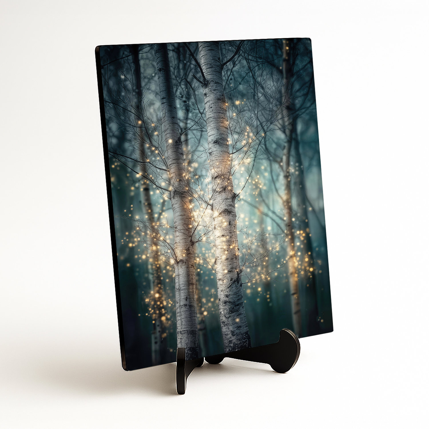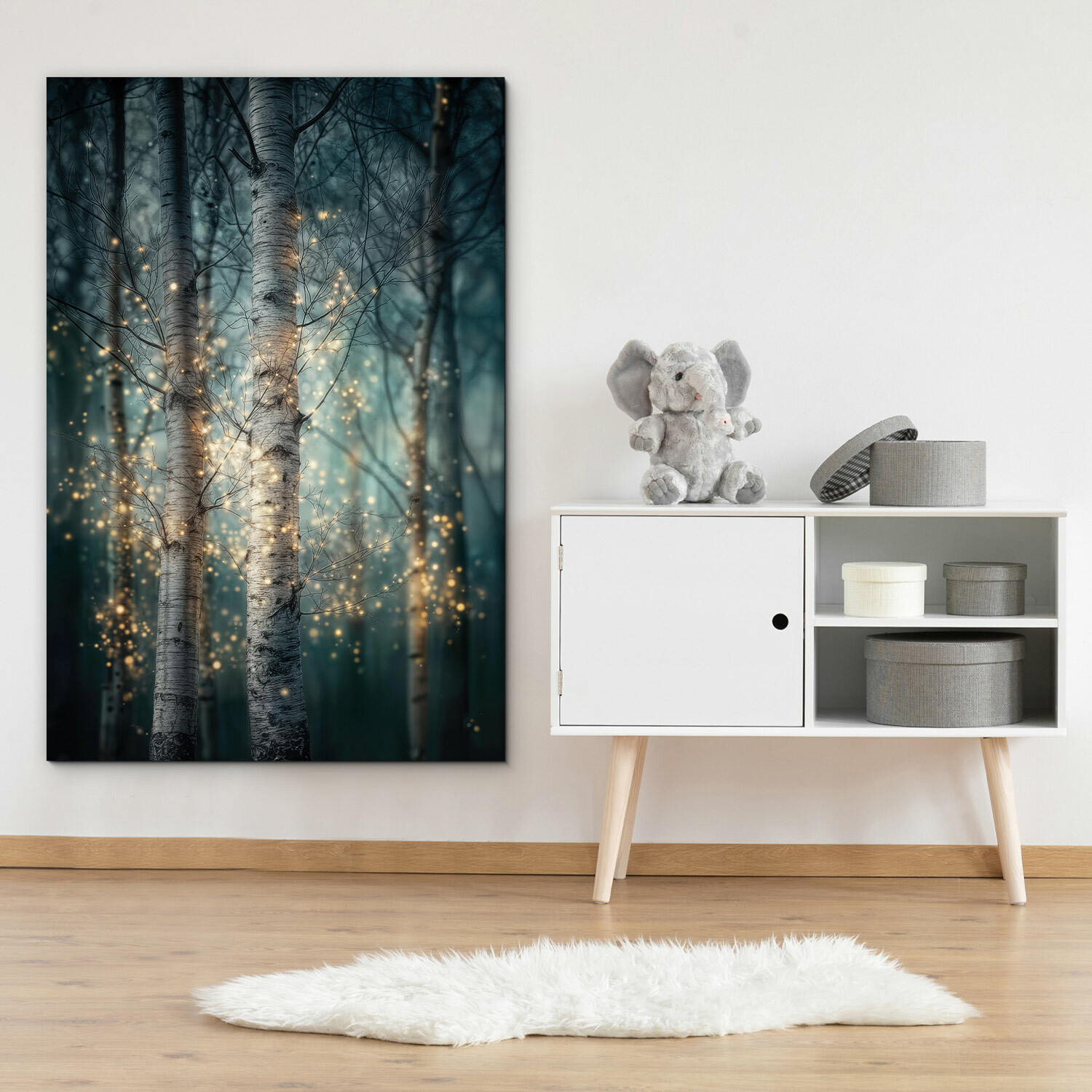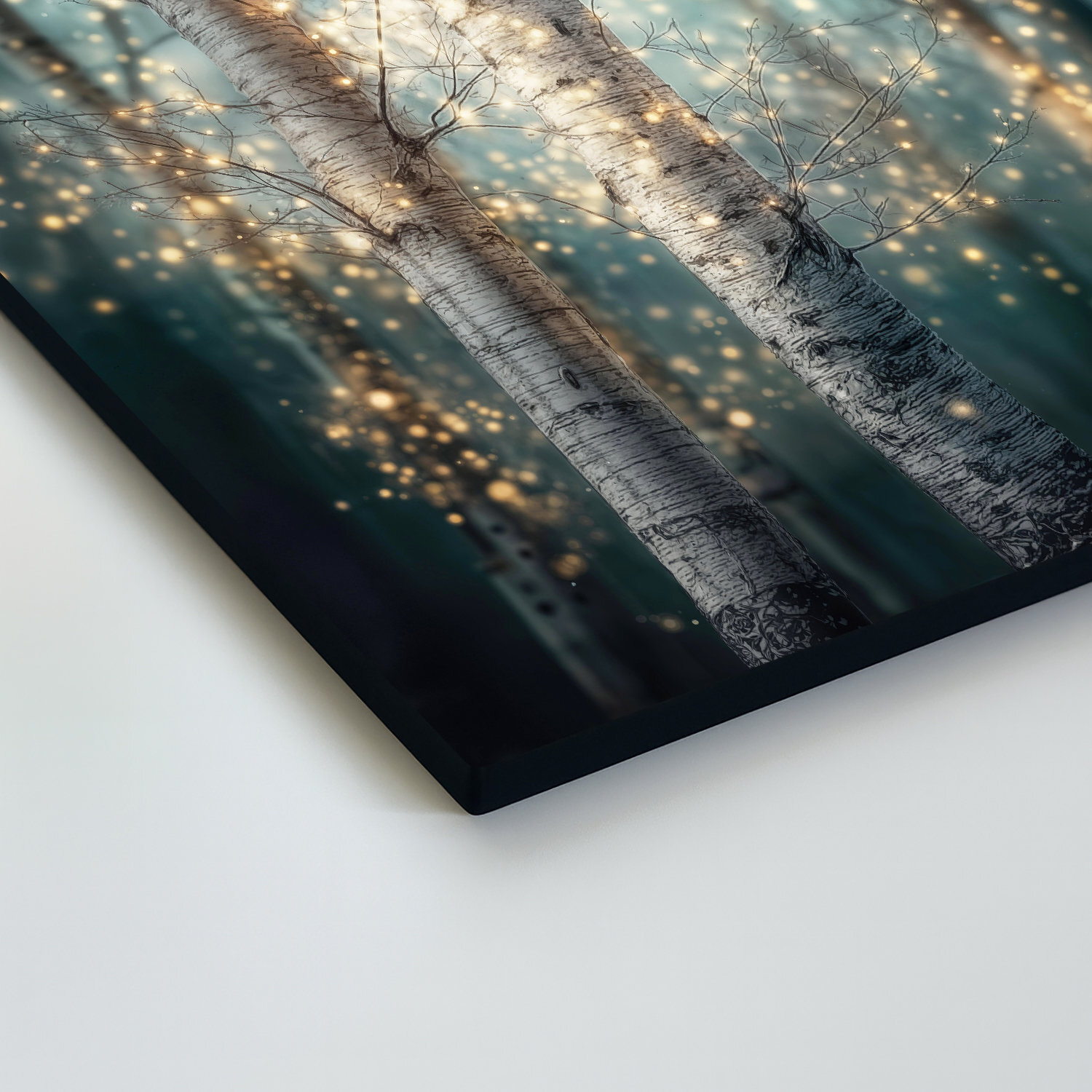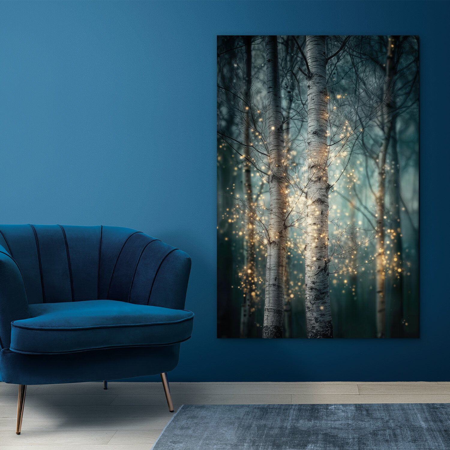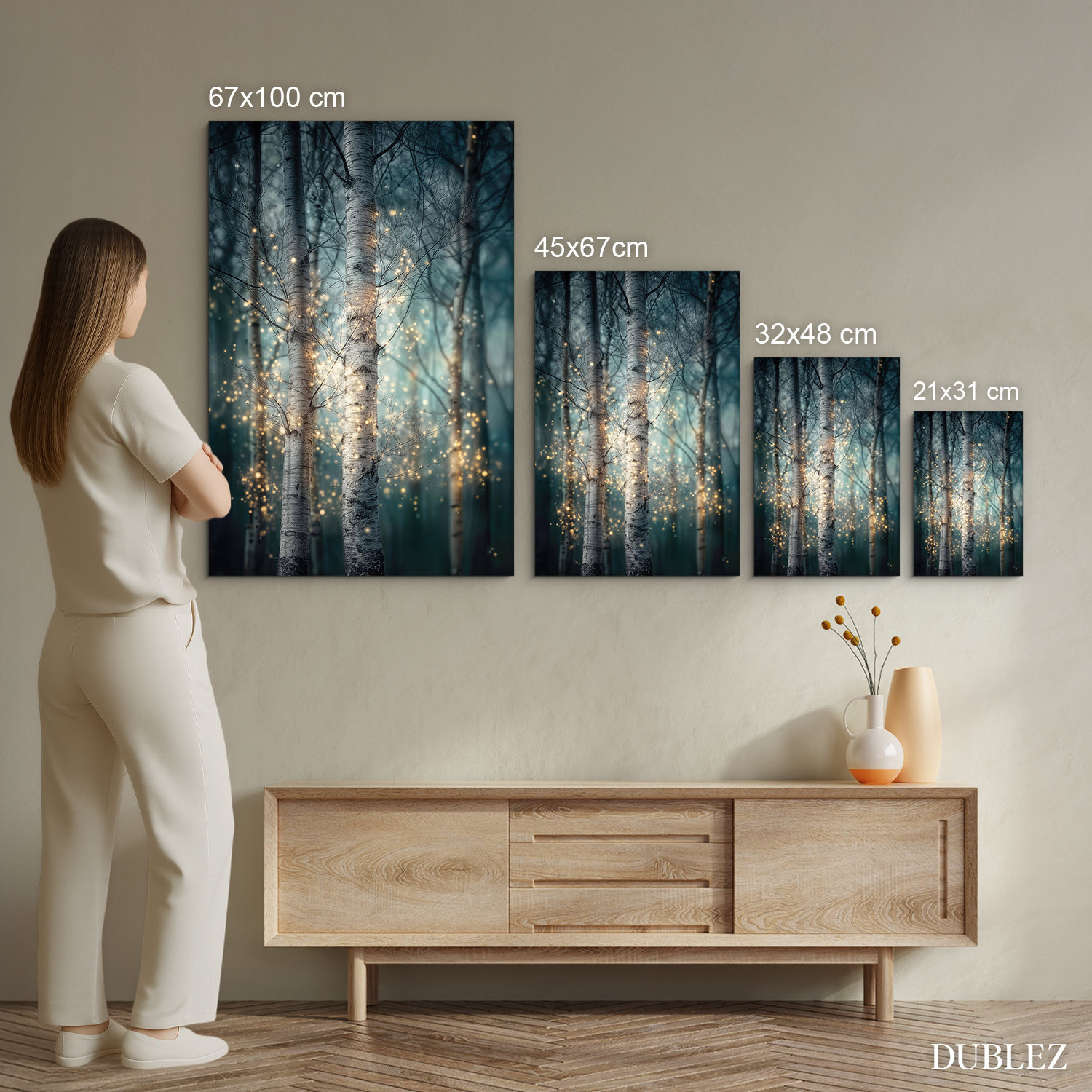 Un tablou colorat cu o pădure de mesteceni și licurici aduce în interior o atmosferă magică, ce amintește de o seară de basm petrecută în natură. Copacii ușor luminați creează un efect romantic și induc o stare de liniște și siguranță, ca și cum v-ați afla în mijlocul unei păduri scăldate în lumina licuricilor. Tabloul se potrivește perfect în living, dormitor sau camera copiilor, unde va contribui la crearea unui spațiu plăcut pentru relaxare și visare.